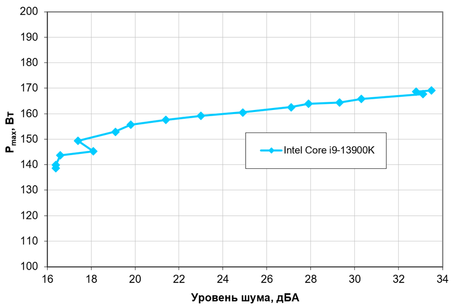Приняв 25 дБА за критерий условной бесшумности, получим примерную максимальную мощность процессоров типа Intel Core i9-13900K, соответствующих этому уровню, это порядка 160 Вт. Можно и больше, но немного На деле вентилятор достаточно тих для того, чтобы увеличить пределы мощности и до 170 Вт. Еще раз уточним: это в жестких (хотя и обыденных на практике) условиях обдува радиатора нагретым до 44 градусов воздухом и для максимальной температуры процессора в 80 °C (в принципе допустимо 100 °C). При снижении температуры воздуха или увеличении максимально допустимой температуры процессора указанные пределы мощности для бесшумной работы и максимальной мощности возрастают.