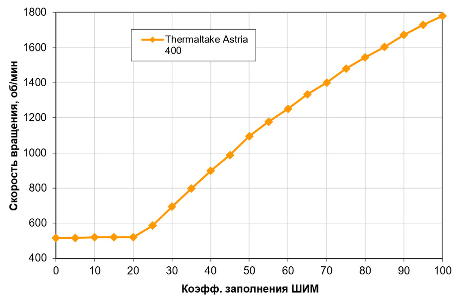 Хороший результат — монотонный рост скорости вращения при изменении коэффициента заполнения (КЗ) от 20% до 100% и широкий диапазон регулировки. Отметим, что при КЗ ниже 20% скорость вращения вентилятора стабилизируется на примерно 515 об/мин, поэтому при необходимости остановить его нужно снижать напряжение питания.