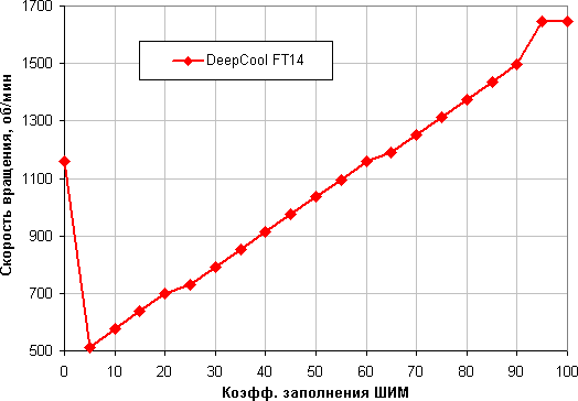 Диапазон регулировки довольно широкий — при изменении КЗ от 5% до 95% скорость вращения растет от примерно 510 до 1650 об/мин. При КЗ 0% скорость снова возрастает до примерно 1160 об/мин. Это может иметь значение, если пользователь хочет создать гибридную систему охлаждения, которая при низкой нагрузке работает полностью или частично в пассивном режиме.