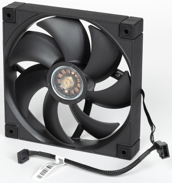 Кабель питания вентилятора от самого вентилятора до проходного разъема просто плоский (7 см), а от этого разъема до основного разъема заключен в плетеную оболочку (еще 15 см). Удлинитель питания (40 см) имеет плоский кабель. Вентилятор поддерживает управление с помощью ШИМ.