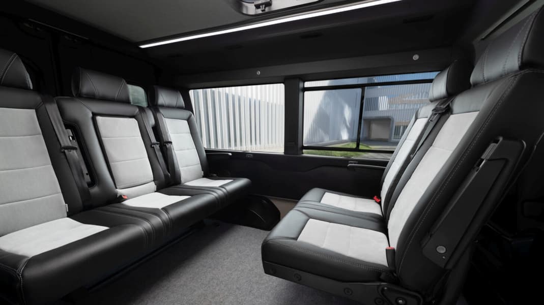 Внутри предусмотрены два кресла второго ряда, которые можно установить по ходу движения или против него, а также трёхместный диван сзади. При необходимости сиденья второго и третьего рядов раскладываются в полноценное спальное место, что делает модель подходящей для дальних поездок.