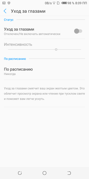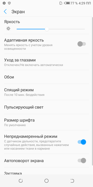При ручном управлении яркостью и при выводе белого поля во весь экран максимальное значение яркости составило около 500 кд/м², минимальное — 6 кд/м². В наличии автоматическая регулировка яркости по датчику освещенности (он находится слева от объектива фронтальной камеры). В автоматическом режиме при изменении внешних условий освещенности яркость экрана как повышается, так и понижается. Работа этой функции зависит от положения ползунка регулировки яркости. Если оставить его на 50% шкалы (по умолчанию), то в полной темноте функция автояркости уменьшает яркость до 30 кд/м² (подходит), в условиях освещенного искусственным светом офиса (около 550 лк) устанавливает на 265 кд/м² (нормально), в очень ярком окружении (соответствует освещению ясным днем вне помещения, но без прямого солнечного света — 20000 лк или немного больше) яркость повышается до 500 кд/м² (до максимума, так и нужно). Результат нас устроил, но для эксперимента мы попробовали уменьшить яркость, передвинув ползунок на 40% шкалы, и получили следующие значения: 10, 210 и 500 кд/м² (для условий темноты яркость уже с запасом низкая). Получается, что функция автоподстройки яркости работает адекватно и позволяет пользователю настраивать свою работу под индивидуальные требования. Формально максимальная яркость высокая, и, учитывая отличные антибликовые свойства, читаемость экрана даже в солнечный день вне помещения может быть на хорошем уровне — но может и не быть: объяснения приведены ниже. В полной темноте можно получить комфортный уровень яркости. На любом уровне яркости значимая модуляция подсветки отсутствует, поэтому нет и никакого мерцания экрана.