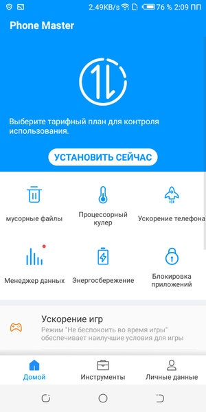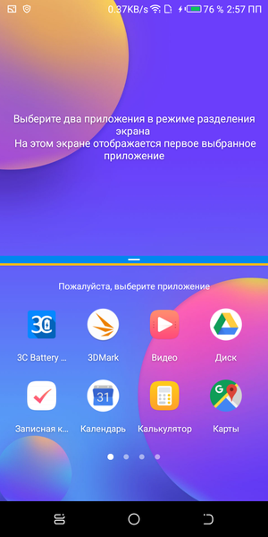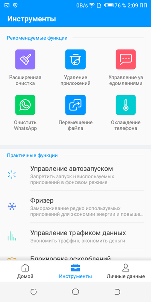 Интерфейс в целом получился достаточно приятным на вид и удобным. Он лаконичен, в нем нет широкой поддержки жестов, дополнительных виртуальных кнопок на экране, однако все, что действительно важно, в интерфейсе имеется. В наличии двухоконный режим, режим для работы одной рукой с уменьшенной рабочей площадью экрана, комплексный менеджер телефона, а также масса разнообразных дополнительных программ, среди которых есть полезные утилиты и клиенты соцсетей, но есть и бесплатные пробные версии игр. Любопытна выведенная на пользовательский уровень функция «заморозки», позволяющая остановить и скрыть на время любое приложение, без необходимости удаления его из памяти.