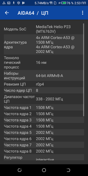 - SoC MediaTek MT6763, 8 ядер (ARM Cortex-A53) @1,5/2,0 ГГц