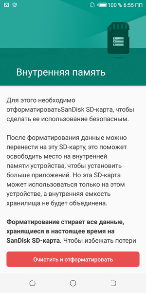 Возможность расширения памяти за счет установки карт microSD есть, к тому же система предлагает форматировать карту в качестве внутреннего хранилища, то есть на нее можно устанавливать и переносить приложения. Также можно подключать внешние флэш-накопители в режиме USB OTG.