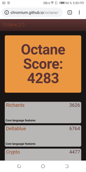 | Google Octane 2 (больше — лучше) | 4283 | 3022 | 4290 | 2649 | 3879 |