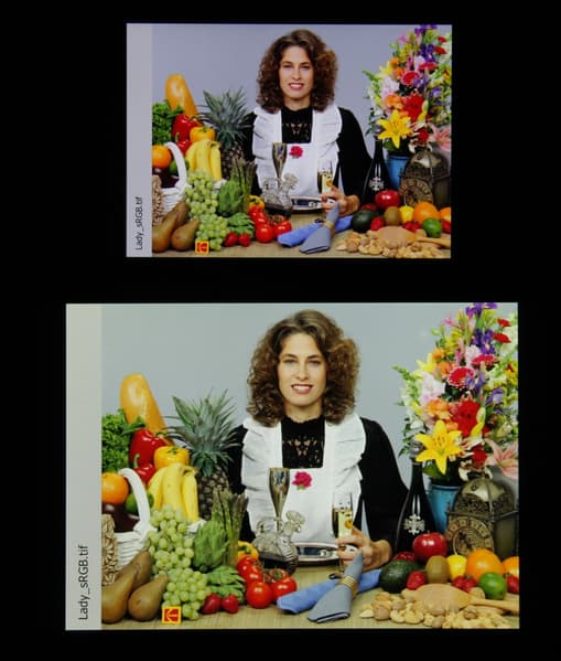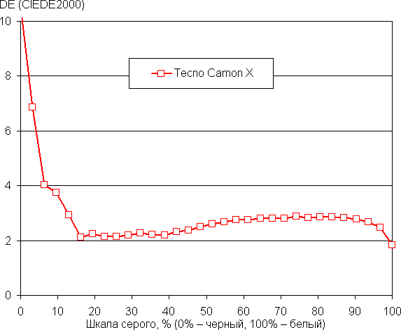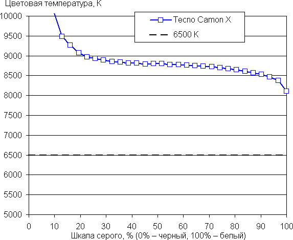 Баланс оттенков на шкале компромиссный, так как цветовая температура существенно выше стандартных 6500 К, но отклонение от спектра абсолютно черного тела (ΔE) на большей части шкалы серого ниже 10, что для потребительского устройства считается хорошим показателем. При этом цветовая температура и ΔE мало изменяются от оттенка к оттенку — это положительно сказывается на визуальной оценке цветового баланса. (Самые темные области шкалы серого можно не учитывать, так как там баланс цветов не имеет большого значения, да и погрешность измерений цветовых характеристик на низкой яркости большая.)