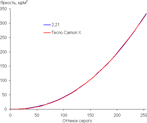 Контрастность (примерно в центре экрана) высокая — порядка 1600:1. Время отклика при переходе черный-белый-черный равно 28 мс (13 мс вкл. + 15 мс выкл.). Переход между полутонами серого 25% и 75% (по численному значению цвета) и обратно в сумме занимает 55 мс. Построенная по 32 точкам с равным интервалом по численному значению оттенка серого гамма-кривая не выявила завала ни в светах, ни в тенях. Показатель аппроксимирующей степенной функции равен 2,21, что близко к стандартному значению 2,2. При этом реальная гамма-кривая немного отклоняется от степенной зависимости: