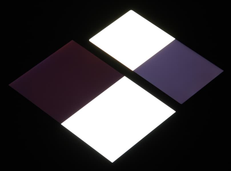 Черное поле при отклонении по диагонали сильно высветляется и приобретает красноватый или красно-фиолетовый оттенок. Фотографии ниже это демонстрируют (яркость белых участков в перпендикулярном плоскости экранов направлении одинаковая!):