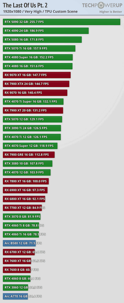 Для разрешения Full HD и получения заветных 60 к/с хватит даже Radeon RX 7600 или GeForce RTX 4060. В 1440p эту отметку без труда берёт немолодая RTX 3070, а в 4K хватит RTX 5070. Также можно отметить, что RTX 5090 в указанных разрешениях выдаёт 256, 219 и 146 к/с.