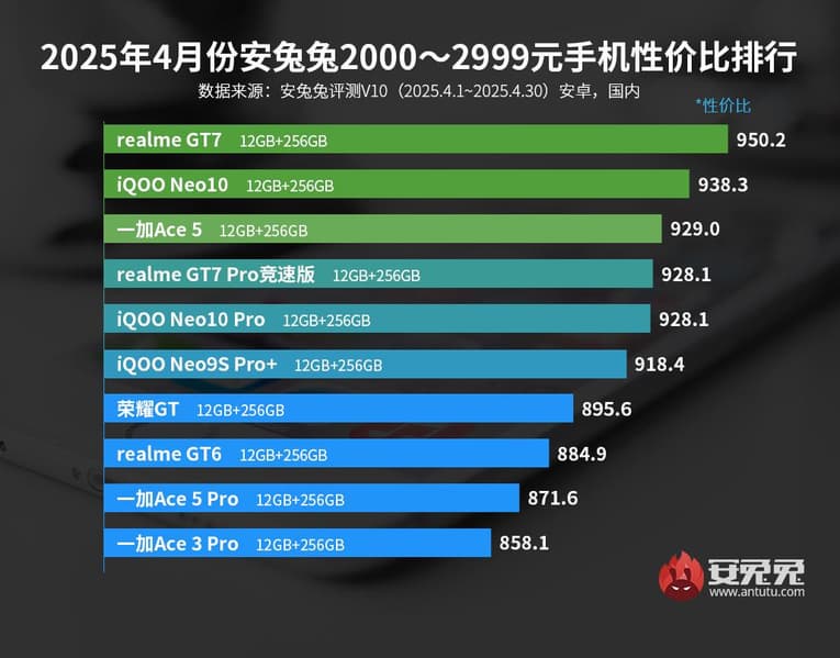 Разработчики бенчмарка AnTuTu опубликовали свежий рейтинг самых выгодных смартфонов по соотношению цены и производительности. В ценовой нише от 2000 до 3000 юаней лидирует Realme GT7, основанный на SoC MediaTek Dimensity 9400+.