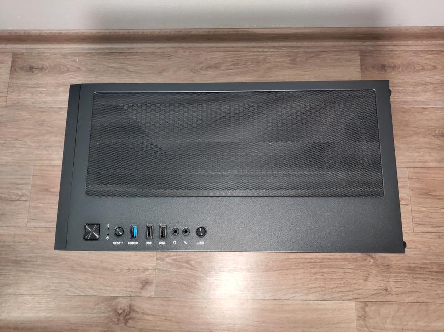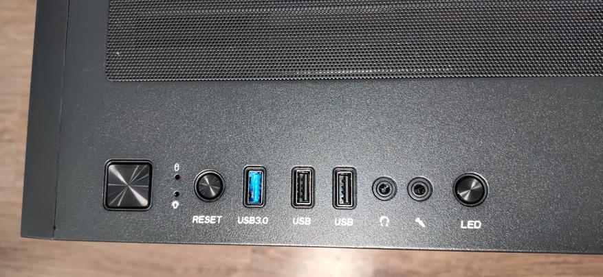 Здесь видим кнопку включения, индикаторы работы ПК и активности накопителя, кнопку сброса, синий порт USB-A (5Гбит/c), два чёрных порта USB-A (480Мбит/c), разъёмы mini jack для подключения наушников и микрофона, а также кнопку для управления ARGB подсветкой. Ещё бы быстрый Type-C порт сюда…