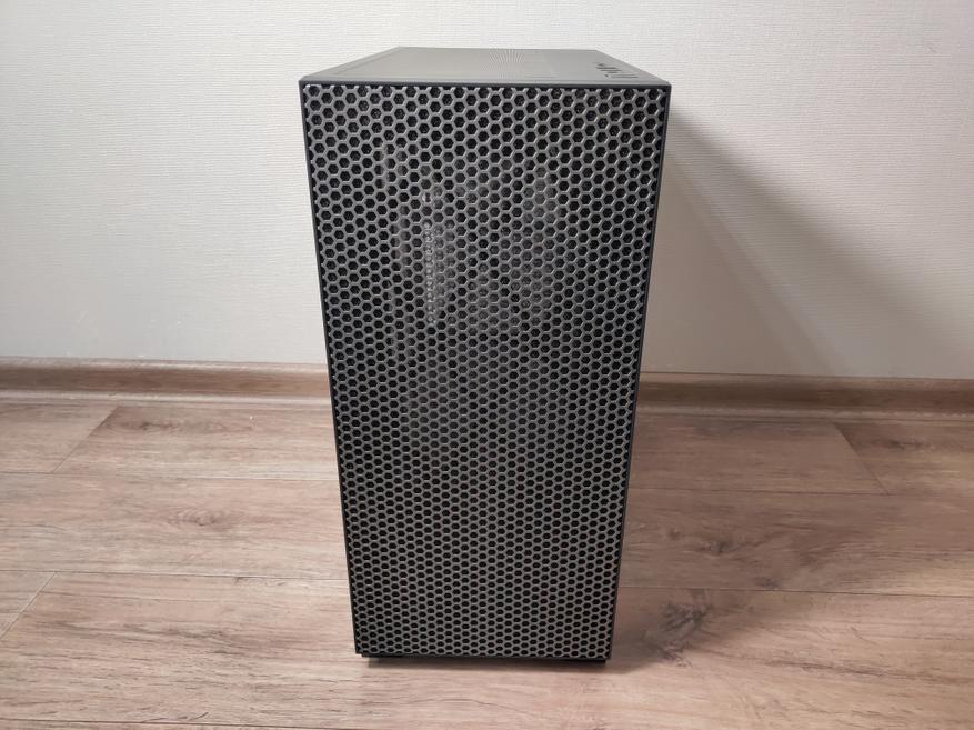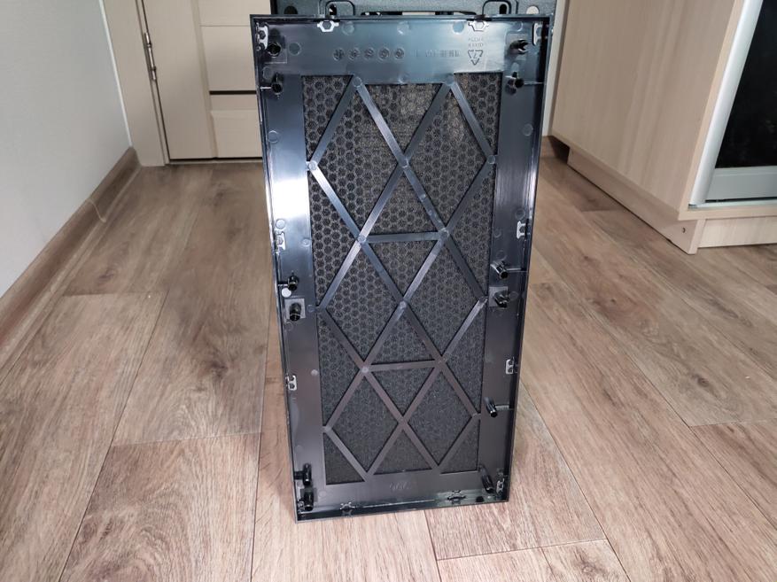 Выглядит корпус достаточно строго (на мой взгляд), и при этом стильно. Ничего лишнего, просто хорошая рабочая лошадка. Спереди расположена металлическая решётка, под которой расположен фильтр из поролона. Передняя часть съёмная.