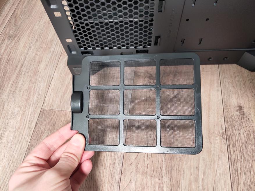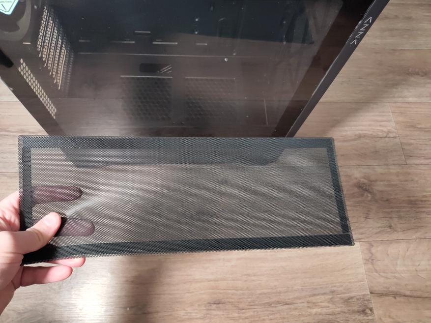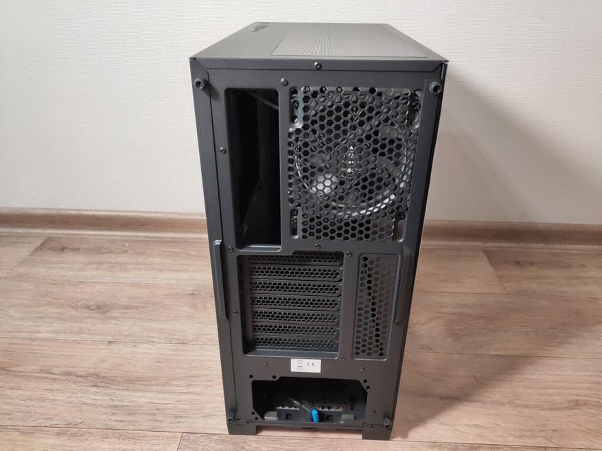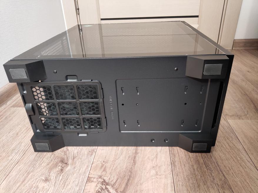Задняя часть выглядит стандартно. Здесь видим семь заглушек для дополнительных карт расширения. Корпус стоит на 4-х мягких ножках, имеющих достаточно приличную площадь. Благодаря ножкам, нижняя часть корпуса приподнята относительно поверхности где он установлен. Сделано это для возможности беспрепятственного забора воздуха вентилятором БП. Что бы БП не копил пыль, предусмотрен быстросъёмный фильтр.