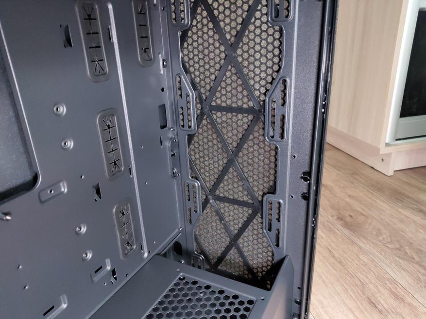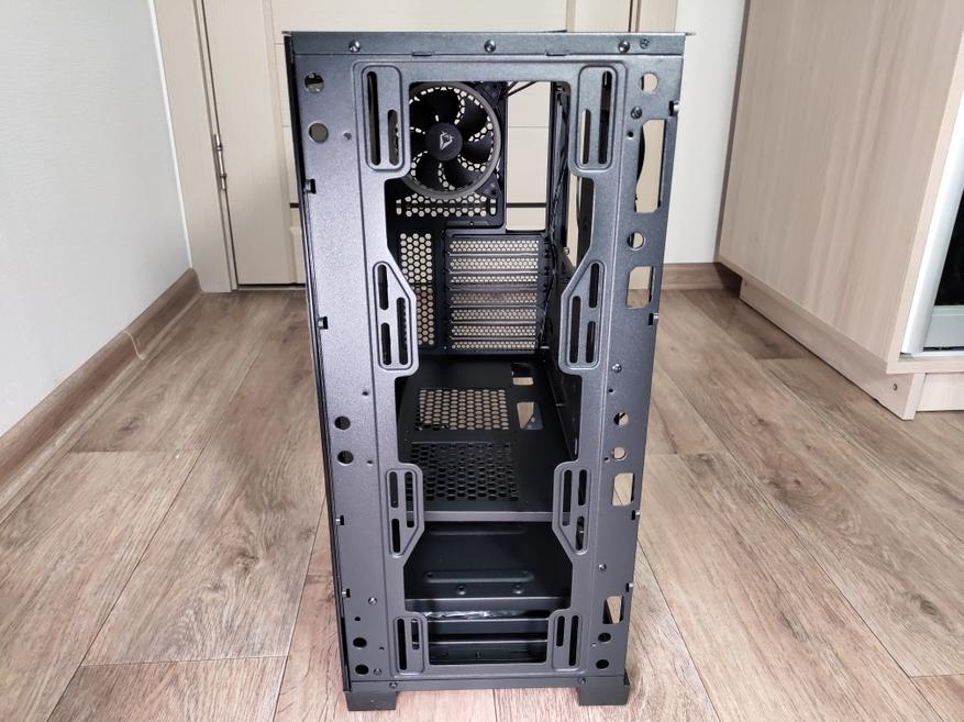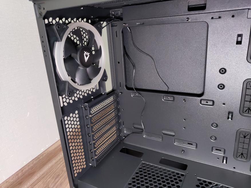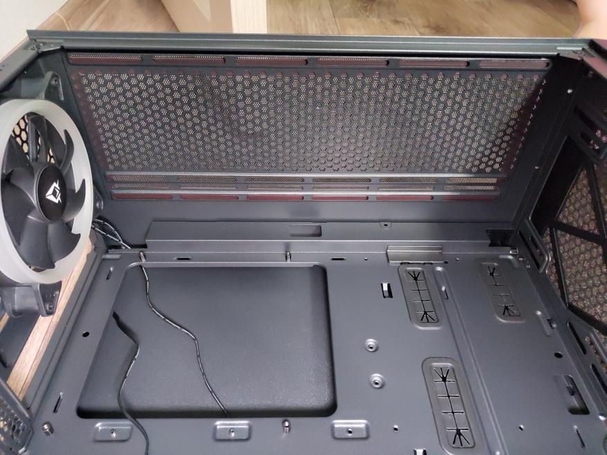 Внутри корпуса достаточно много места. Уже предустановлен 120мм вентилятор с ARGB подсветкой. Спереди виден тонкий фильтр из поролона, удерживаемый пластиковыми направляющими. Вероятно, будет не очень удобно его обслуживать, так как он снимается вместе с передней панелью, в которой достаточно надёжно зафиксирован. Сюда можно установить радиатор СВО на 360мм, или три 120мм вентилятора.