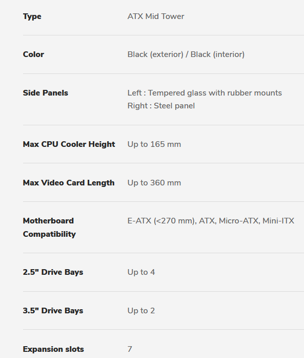 В корпус можно установить видеокарту с максимальной длинной 360мм, башенный кулер с максимальной высотой 165мм, до четырёх SSD формата 2.5 дюйма, либо до двух HDD формата 3.5 дюйма, до девяти 120мм вентиляторов. Поддерживаются материнские платы формата E-ATX (<270 mm), ATX, Micro-ATX, Mini-ITX.