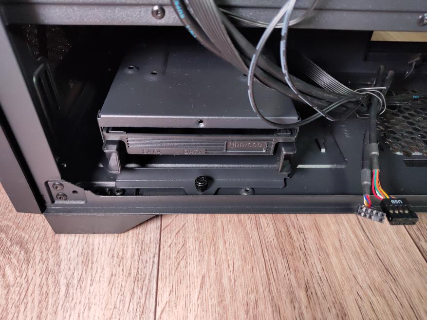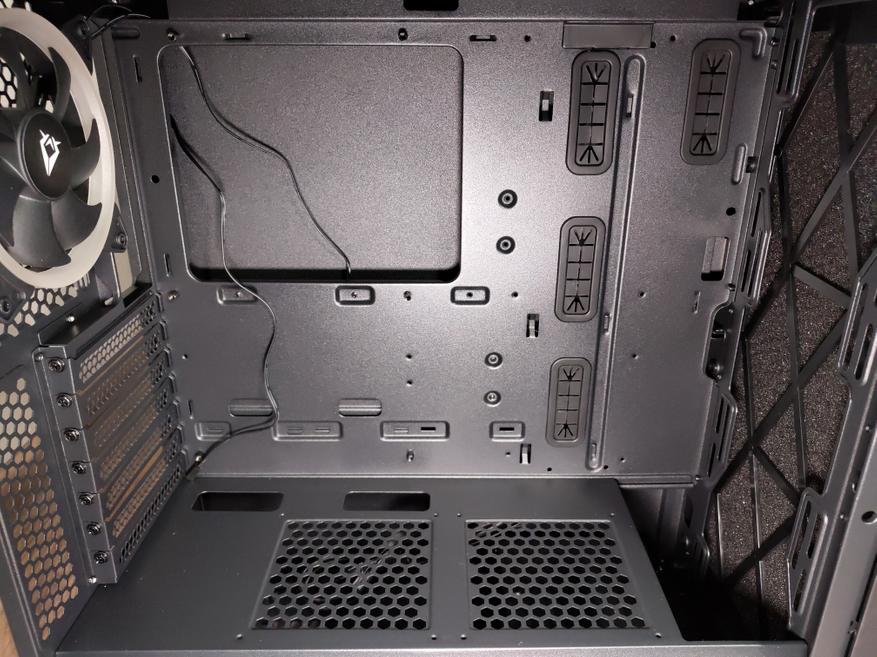Здесь же видим предустановленный контроллер ARGB подсветки, а также съёмную корзину, предназначенную для установки одного HDD формата 3.5 дюйма, либо двух SSD формата 2.5 дюйма. Еще два дополнительных места предусмотрено для установки SSD 2.5 дюйма. Для проброса кабелей имеются специальные резиновые уплотнители, прикрывающие отверстия в корпусе. За счёт них кабель фиксируется более надёжно, и меньше искажается поток воздуха внутри корпуса.