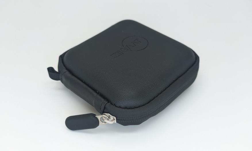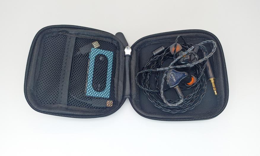 В комплект положили вместительный плоский кейс. Крышка упругая, но не сильно жесткая и прогибается. У кейса есть сетчатый кармашек на резинке, закрывающийся еще одним кармашком. Наушники в кейс помещаются хорошо вместе с не самым компактным портативным ЦАПом. Молния чуть туговата, но зато на ней хорошая пыле- и, похоже, что даже влагозащита.