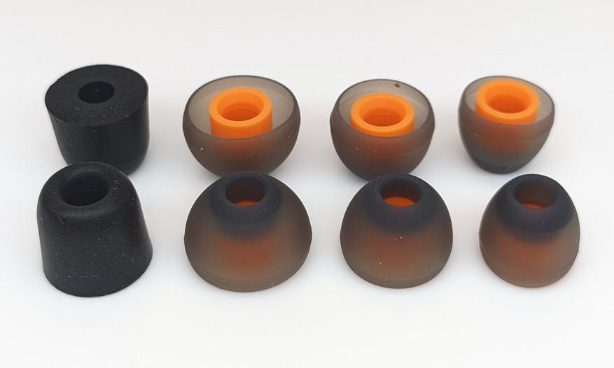 Наушники очень удобные, но комплектные насадки мне не очень подошли. У них жесткий, толстый и длинный звуковод и довольно жесткий купол. Вкупе с широким звуководом наушников мне даже с размером насадок S стало давить в ушном канале. Но из опыта общения с другими меломанами я понял, что у меня не очень широкий, по-научному называемый наружный слуховой проход. Еще наушники довольно сильно торчали из ушей с этими насадками. Но стоит отметить, что чувствуются они по исполнению как что-то брендовое. У них немного нестандартная вытянутая форма и приятный, бархатистый и цепкий материал. Пенные же — как обычные пенки.