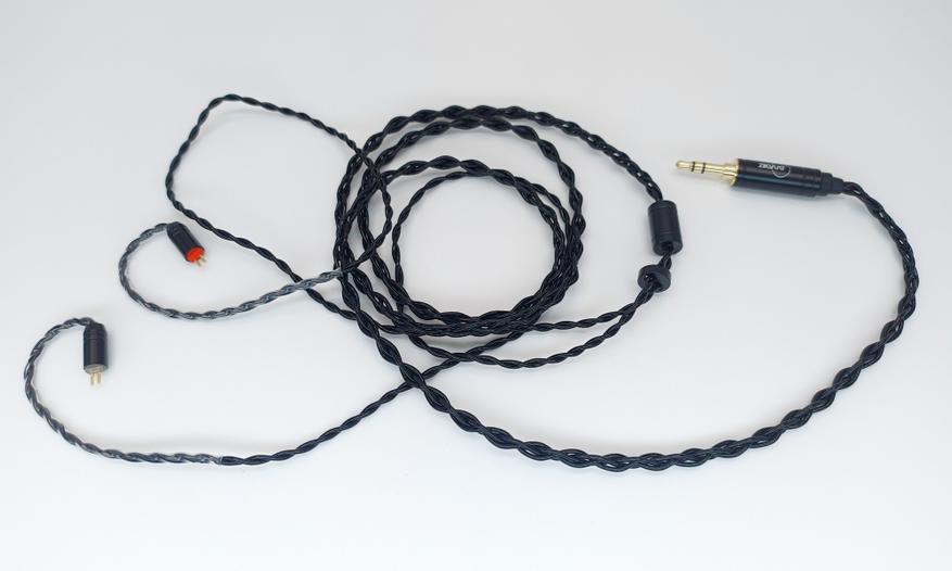 Четырехжильный комплектный кабель на вид немного простоват и тонковат, вследствие чего мог бы быть склонным к запутыванию, но частично это компенсирует упругость кабеля. Мне всё равно нравятся такие кабели. Пусть и не выглядит он дорого-богато, зато не болтается как канат и не давит на уши своим весом. А разница между легким и тяжелым кабелем очень даже заметна и влияет на комфорт использования.