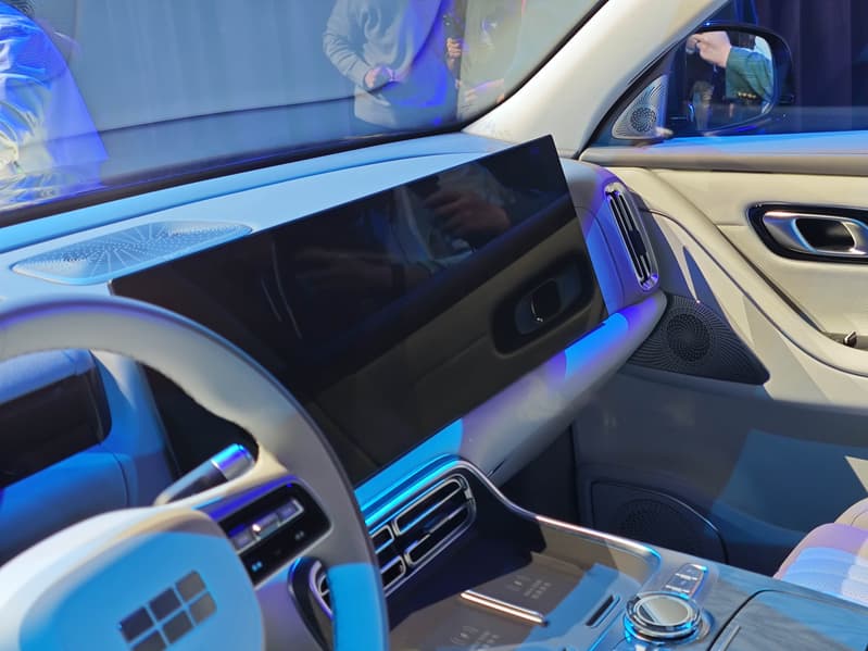 Передняя панель оснащена большим сенсорным экраном, он длинный и, фактически, перекрывает зону как обычного центрального экрана, так и пассажирской части передней панели. В комбинации цифровой приборной панели экран поменьше, но предусмотрен и проекционный дисплей.