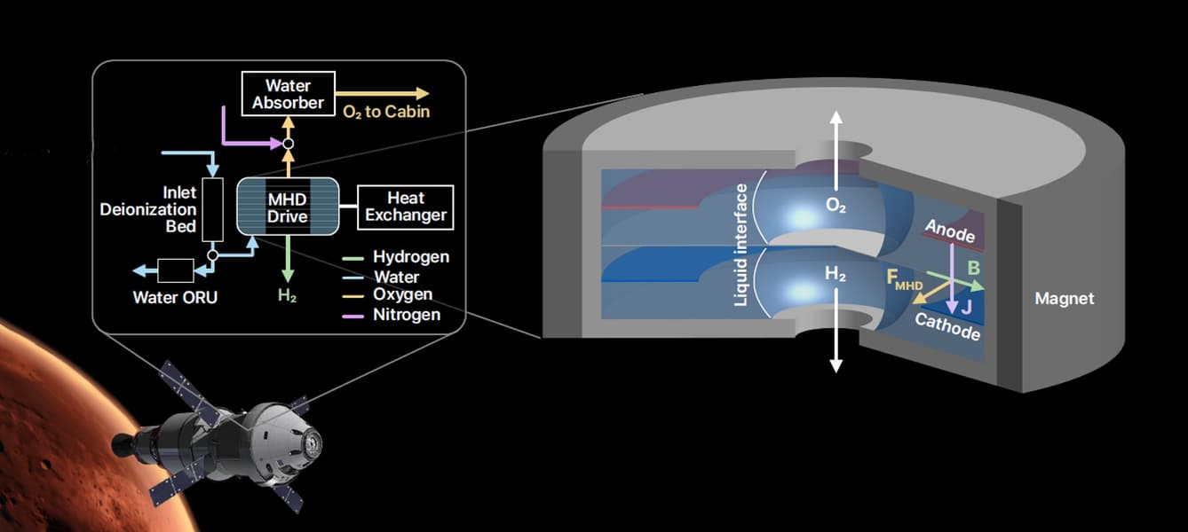 Инженеры NASA и партнёры из Германии представили новую технологию для генерации кислорода в космосе, критически важную для будущих полётов на Марс. Система MOGA (Magnetohydrodynamic Oxygen Generation Assembly) заменяет традиционные насосы и центрифуги магнитным управлением потоками воды и газа, что повышает надёжность и снижает массу оборудования.