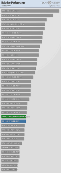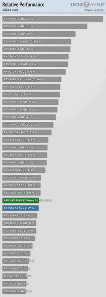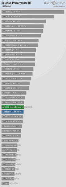И новинка AMD действительно выступает конкурентом. Если брать за основу обзор TechPowerUp, карта AMD в Full HD всего на 3-4% отстаёт от RTX 5060 Ti и примерно на 8-10% обходит RTX 5060. В 1440p разрыв со старшей картой Nvidia увеличивается примерно на 1 процентный пункт, а вот RTX 5060 начинает отставать ещё сильнее. Также можно сказать, что RX 9060 XT находится примерно на уровне RX 7700 XT.