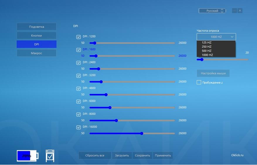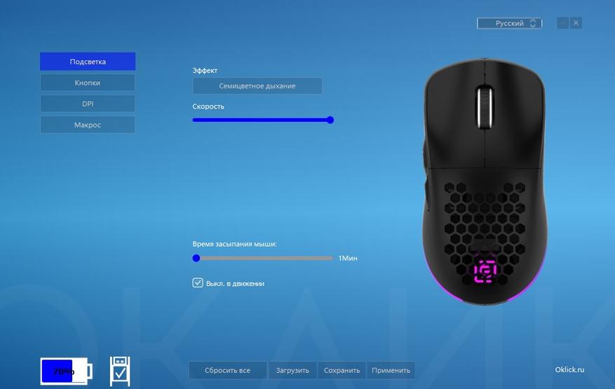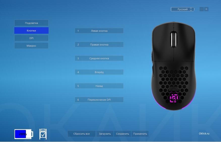 Беспроводная мышь Оклик 900GMW имеет собственное программное обеспечение, которое можно скачать на официальном сайте. После скачивания, установки и открытия утилиты, мы можем наблюдать довольно простенькое оформление, но со всеми необходимыми настройками. В утилите имеется 4 основных вкладки: вкладка подсветка — в которой можно выбрать эффект подсветки, отрегулировать скорость мерцания и конечно выставить время засыпания. Вкладка кнопки — предусматривать переназначение кнопок для выполнения необходимых команд. Вкладка DPI — используется для изменение частоту опроса и изменения и настройки DPI. Вкладка макросы — используется для управления и создания макросов. В ней пользователь может редактировать, создавать, сохранять, выбирать профили. Также хочется отметить, что открыв утилиту, пользователь сможет увидеть остаточный заряд аккумулятора.