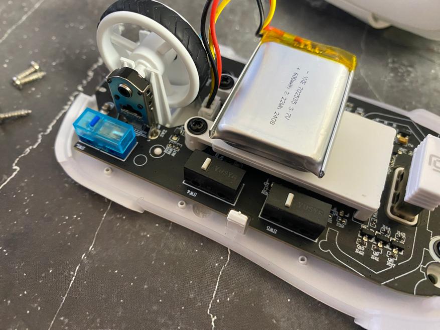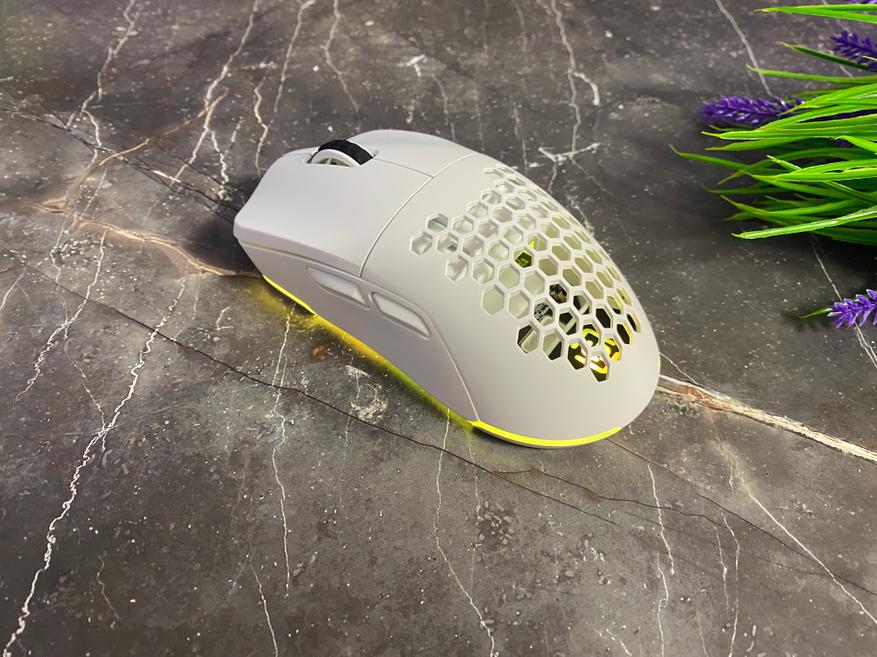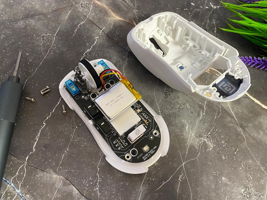 Для разборки мыши нам понадобится снять глайды и открутить несколько винтов, далее просто разделяем мышку на 2 части. После разборки можем наблюдать все компоненты внутреннего пространства, а именно аккумулятор 600 mAч с возможностью беспроблемной замены. Аккумулятор с 100 % зарядкой обеспечивает бесперебойную работу в течение 70 часов, но конечно, данное время можно увеличить при помощи полного отключения светодиодной подсветки. Время зарядки аккумулятора составляет 2 часа. В сердце мыши установлен хороший сенсор PixArt PAW 3395 с максимальным разрешением 26000 dpi, максимальным ускорением 50 G и частотой опроса 1000 Гц. Боковые кнопки используют переключатели YUSYA с белой кнопкой, а основные кнопки используют синие переключатели HUANO с ресурсом больше 50 млн нажатий.