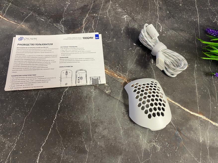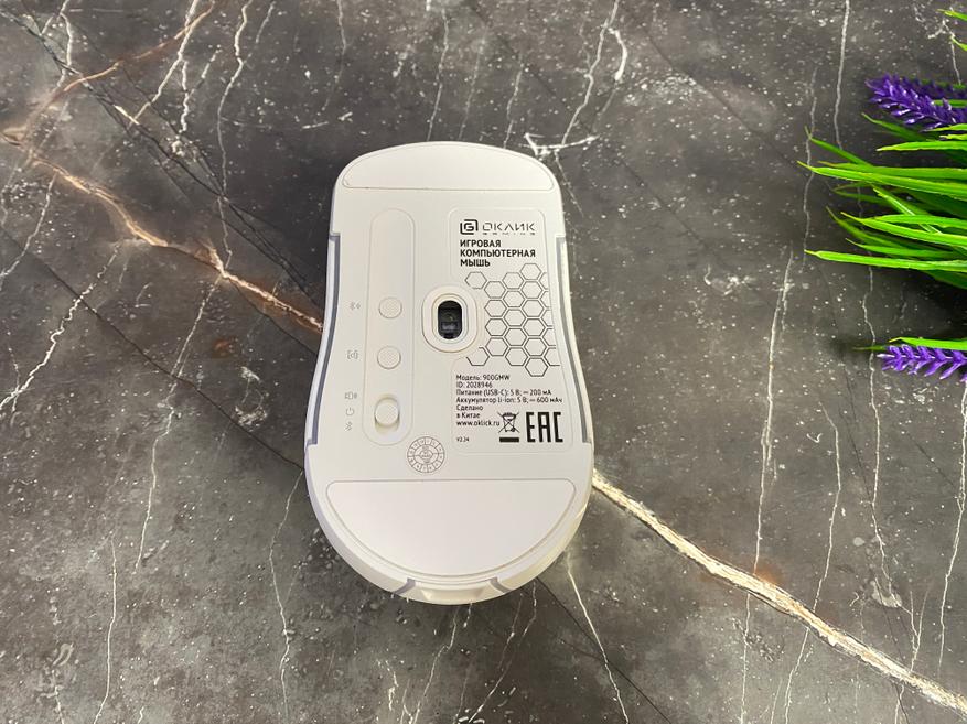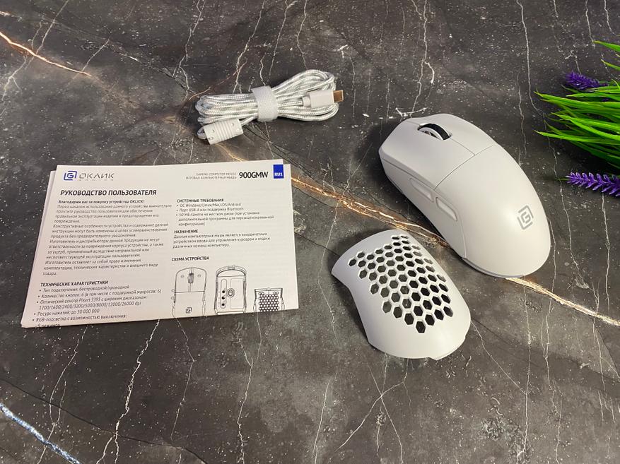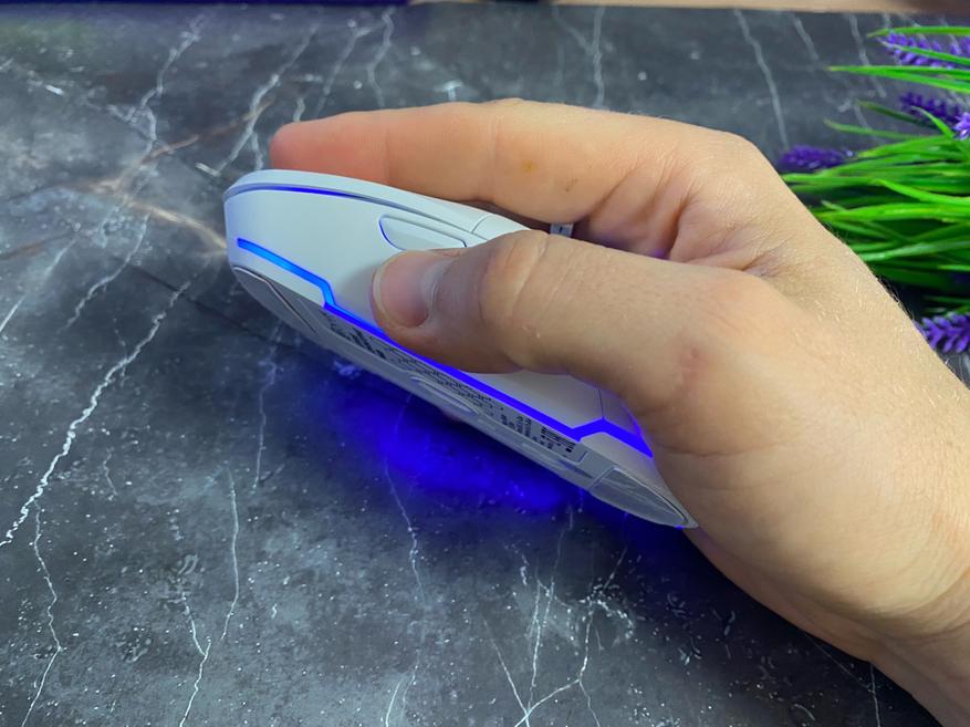 На обороте в (нижней части) имеются 2 широких тефлоновых глайда, благодаря которым мышка прекрасно перемещается по любому типу покрытия. Сам сенсор расположен в центральной части, с левой стороны расположились кнопка включения/выключения/выбор тип подключения, кнопка DPI, кнопка для переключения каналов Bluetooth. Кабель USB имеет тканевую оплетку и выполнен также в белом цвете. Руководство по использованию содержит таблицу с техническими характеристиками, а также важную информацию о включении, изменении подсветки и многое другое.