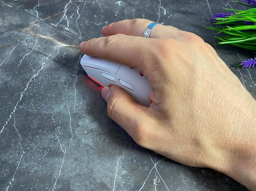 В руке мышка лежит комфортно и благодаря приподнятому корпусу в верхней части снижается нагрузка на кисть и даже после длительного использования мыши, дискомфорта в кисти не наблюдается. При стандартной длине пальцев, кнопки находятся непосредственно в нужном месте.