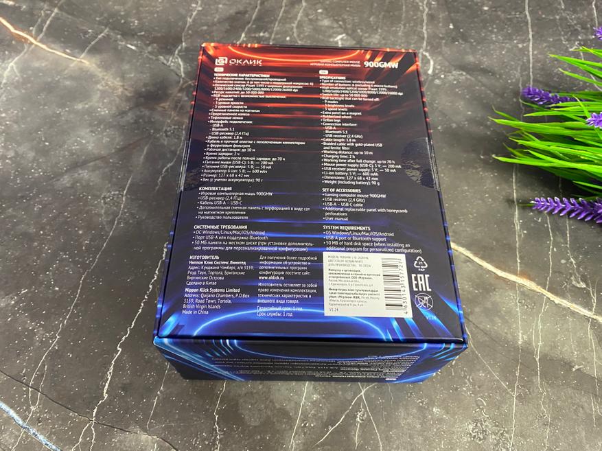 Упакована беспроводная мышь Оклик 900GMW в яркую картонную коробку небольшого размера с указанием основных технических характеристик на задней части и визуальное отображение самой модели на лицевой стороне. Внутри коробки мышка уложена в индивидуальный пакет, а также зафиксирована в пластиковом ложементе. Комплектация довольно стандартная и имеет: саму беспроводную мышь Оклик 900GMW, сменную панель, кабель USB-A — USB — Type-C, документацию.