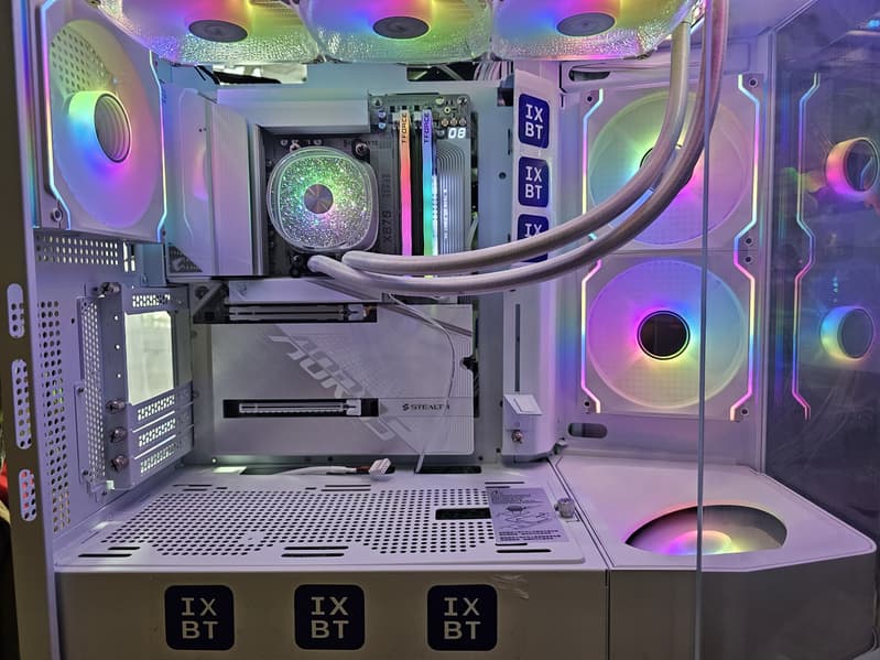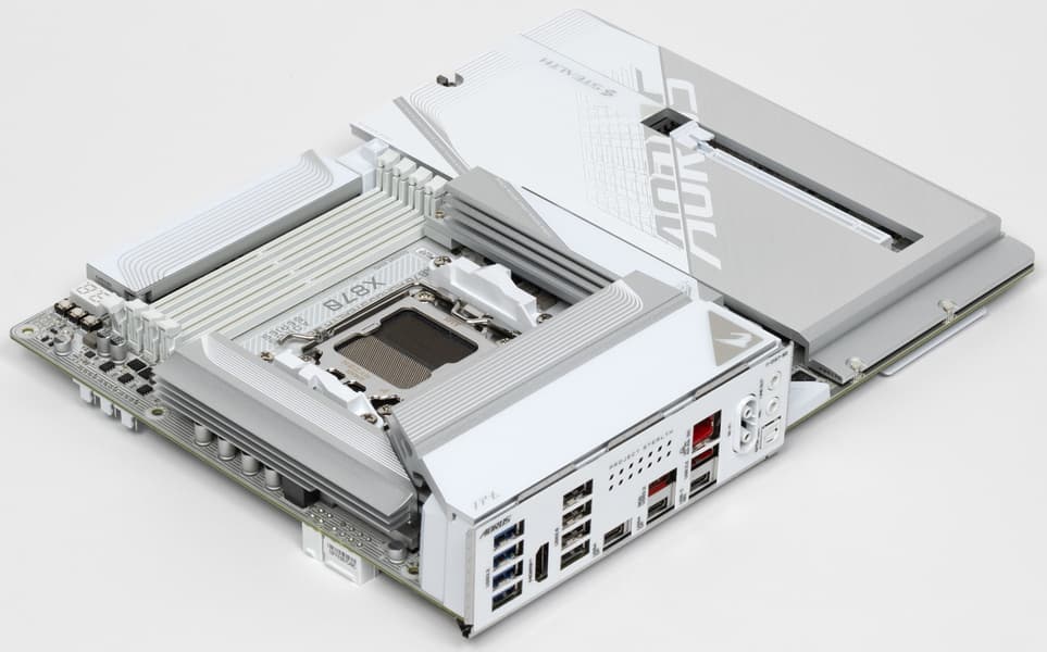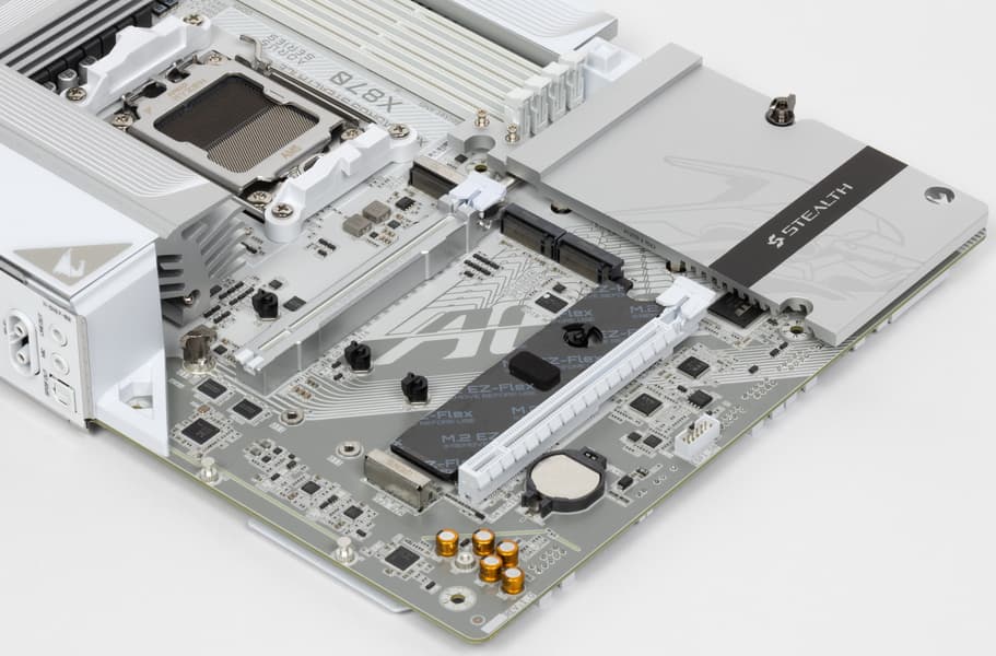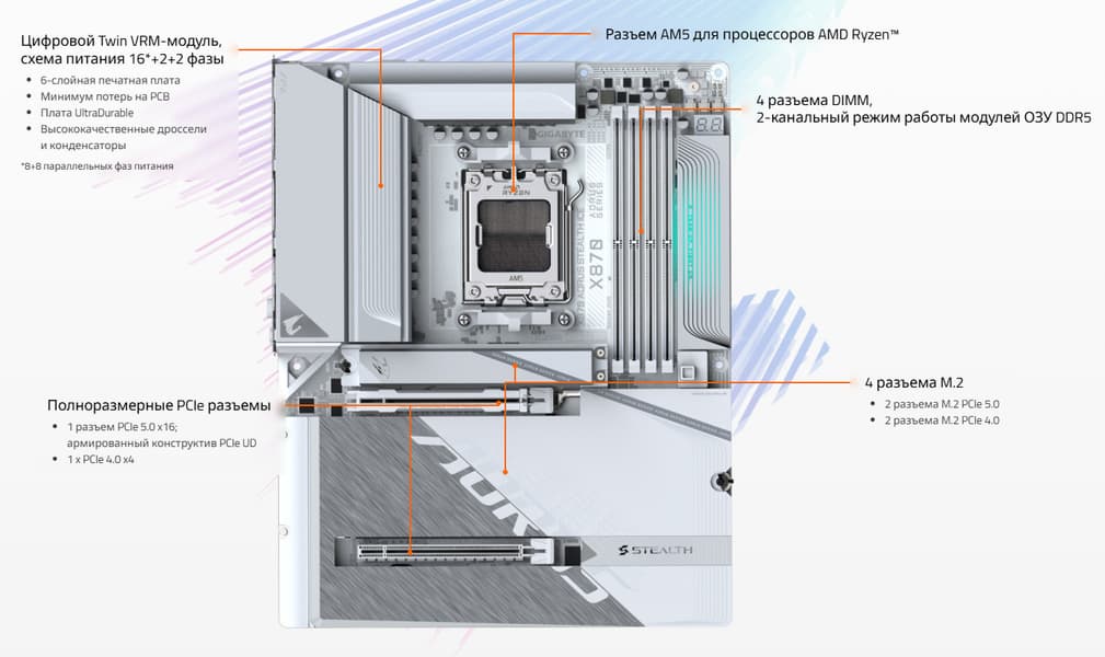 Материнская плата Gigabyte X870 Aorus Stealth Ice — модель достаточно высокого уровня на чипсете AMD X870, ее стоимость ожидается в пределах 45-50 тысяч рублей (на момент публикации обзора продажи еще не начались). Она поддерживает процессоры AMD Ryzen 7000/8000/9000 и создана для геймеров и продвинутых пользователей. Плата уникальна тем, что большинство разъемов у нее вынесены на тыльную сторону текстолита, а на лицевой остались лишь процессорный сокет, слоты памяти, PCIe и M.2. Это дает возможность оставлять все требуемые кабели с задней стороны корпуса, освободив от них видимую переднюю часть. В результате получается красивый ПК белого цвета без торчащих кабелей, но корпус нужен специальный, с вырезами для разъемов платы в монтировочной пластине.