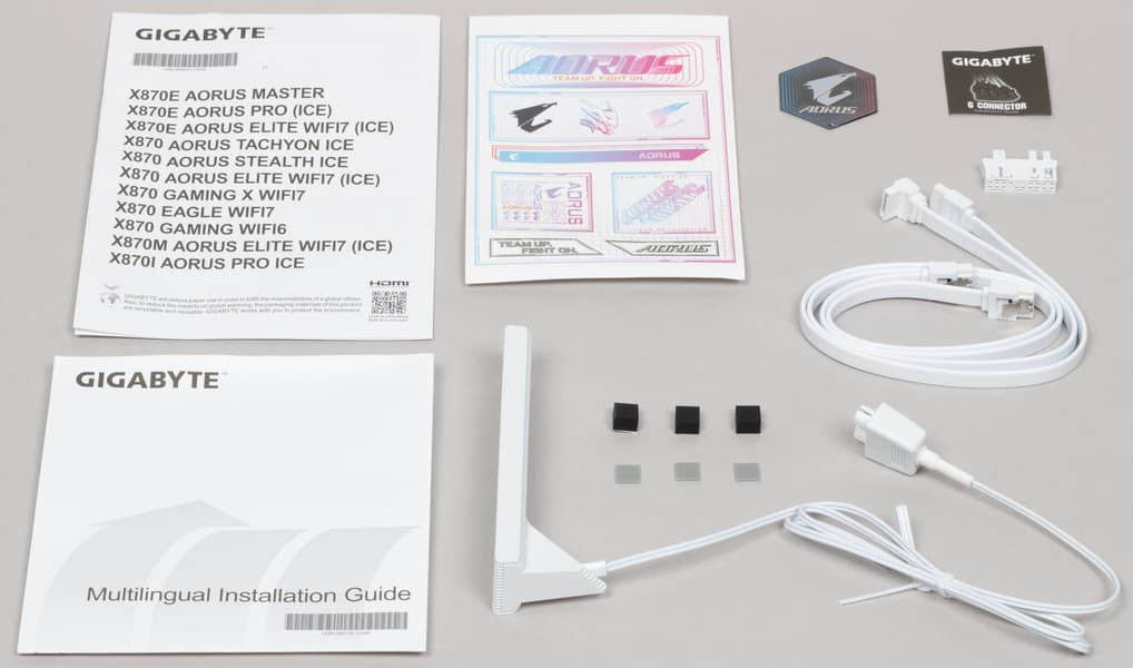 Несмотря на особенность серии Stealth, внутри суббренда Aorus данная плата не является флагманским решением, поэтому комплект поставки относительно скромен: кроме традиционных элементов типа руководства пользователя и кабелей SATA, имеются антенна встроенного Wi-Fi/BT-модуля, фирменный G-connector для передней панели, бонусные наклейки и запасные слайдеры для M.2 слотов.