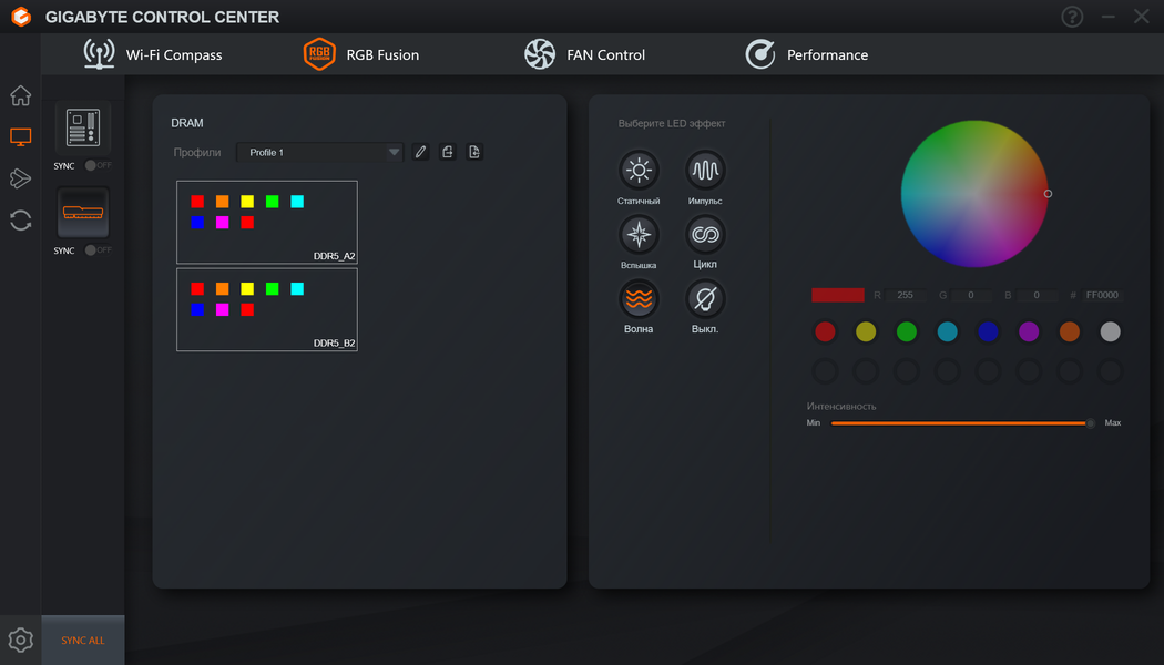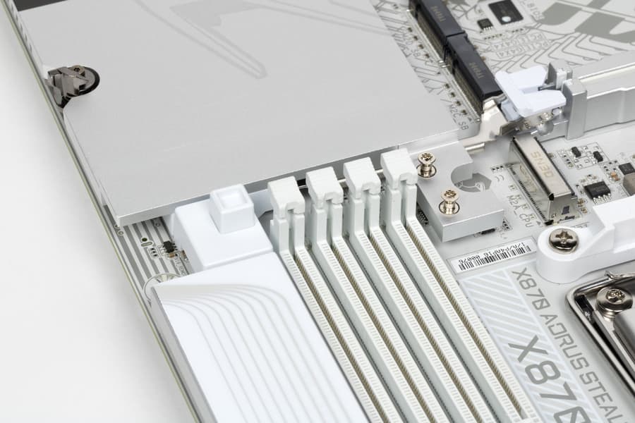 Для установки модулей памяти на плате имеется четыре DIMM-слота (для работы памяти в Dual Channel в случае использования всего 2 модулей их следует устанавливать в А2 и B2). Плата поддерживает небуферизованную память DDR5, а максимальный объем памяти составляет 256 ГБ. Поддерживаются профили XMP и Expo.