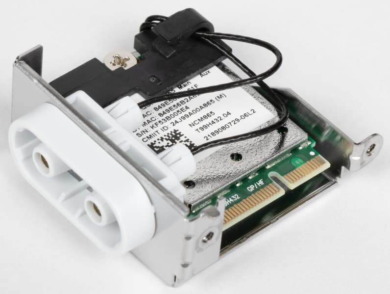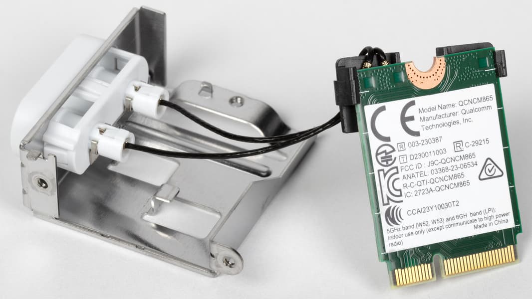 Имеется и комплексный беспроводной адаптер на контроллере Qualcomm QCNCM865, через который реализованы Wi-Fi 7 (802.11a/b/g/n/ac/ax/be) и Bluetooth 5.4. Он установлен в слот M.2 (E-key), и его разъемы для привинчивания выносных антенн выведены на заднюю панель.