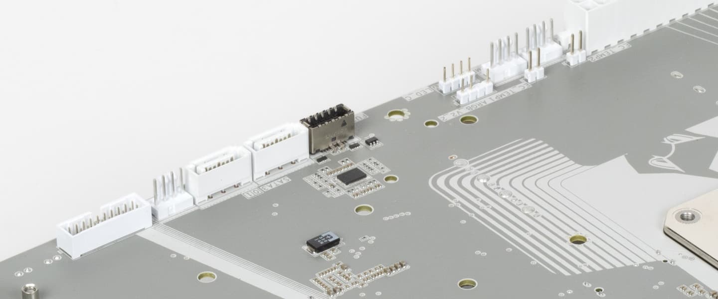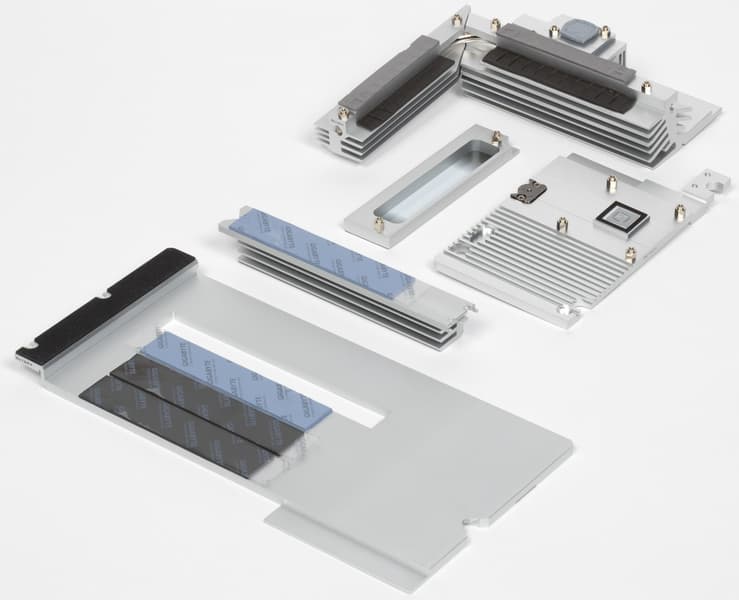 У всех модулей M.2, как я уже выше отмечал, есть свои радиаторы с термоинтерфейсом. У верхнего — свой отдельный радиатор, у трех остальных — общий. Следует особо отметить, что слот M2B_CPU оснащен термопрокладками с обеих сторон. То есть под слотом также есть плоский тонкий радиатор.