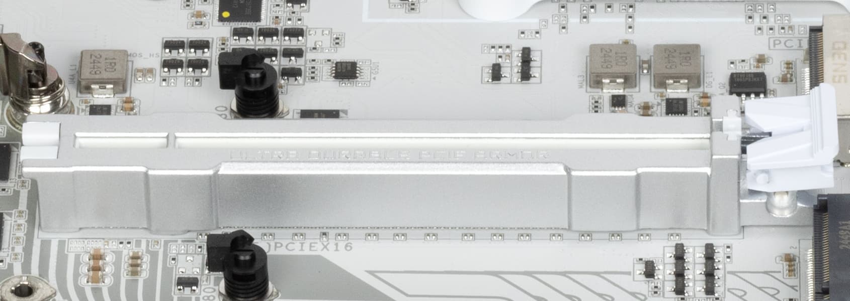 Первый («процессорный») слот PCIe x16 имеет металлическое армирование из цинкового сплава, которое увеличивает надежность. Кроме того, такая защита предохраняет слот от электромагнитных помех.