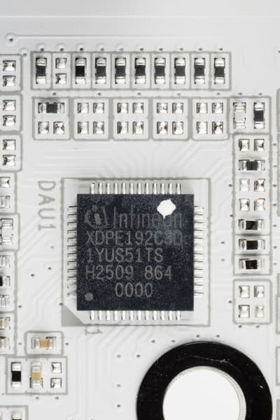 Управляет фазами VCore и SoC цифровой контроллер XDPE192C3D от Infineon, он способен работать максимум с 12 фазами, так что уже очевидно, что используется параллельная схема для VCore (8x2). Плюс 2 фазы SoC.