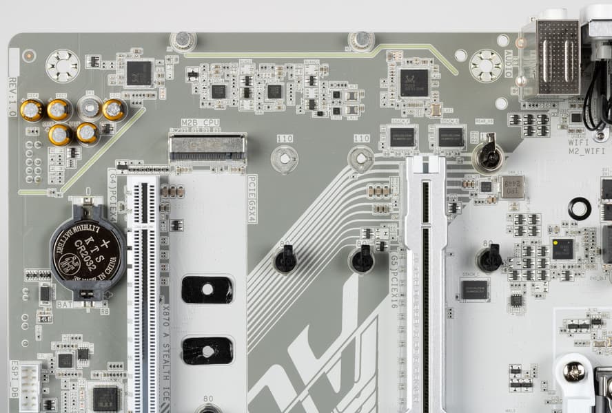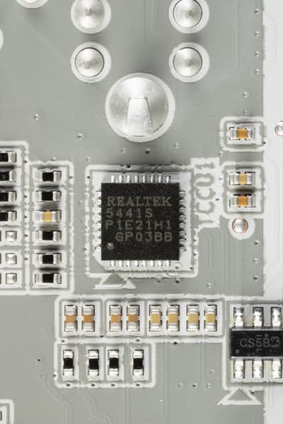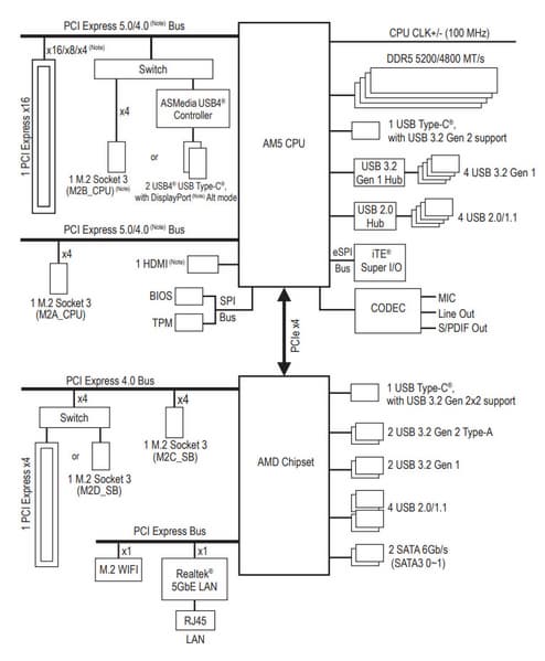 В процессорах Ryzen встроен контроллер High Definition Audio (HDA), связь с аудиокодеком идет путем эмуляции PCI шины. А также контроллер USB 2.0 Genesys Logic GL850G использует линию USB 2.0 от CPU, а Realtek RTS5411 использует 1 линию USB 3.2 Gen1 от X870 (детали ниже в разделе USB портов).
