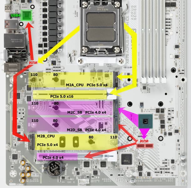 - Переключатель: или хаб USB4 ASMedia ASM4242 или порт M.2 (M2B_CPU) (4 линии PCIe 4.0)