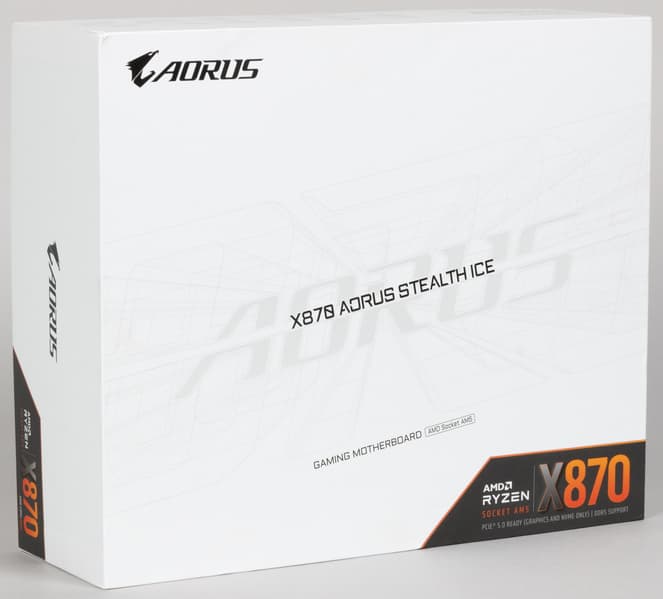 Gigabyte X870 Aorus Stealth Ice поставляется в большой коробке из жесткого картона со снимаемой крышкой, на которой мы видим по сути белый дизайн с логотипами, это уже нам говорит о том, что внутри – матплата светлых тонов. Однако, где же знаменитый орлиный дизайн серии Aorus?