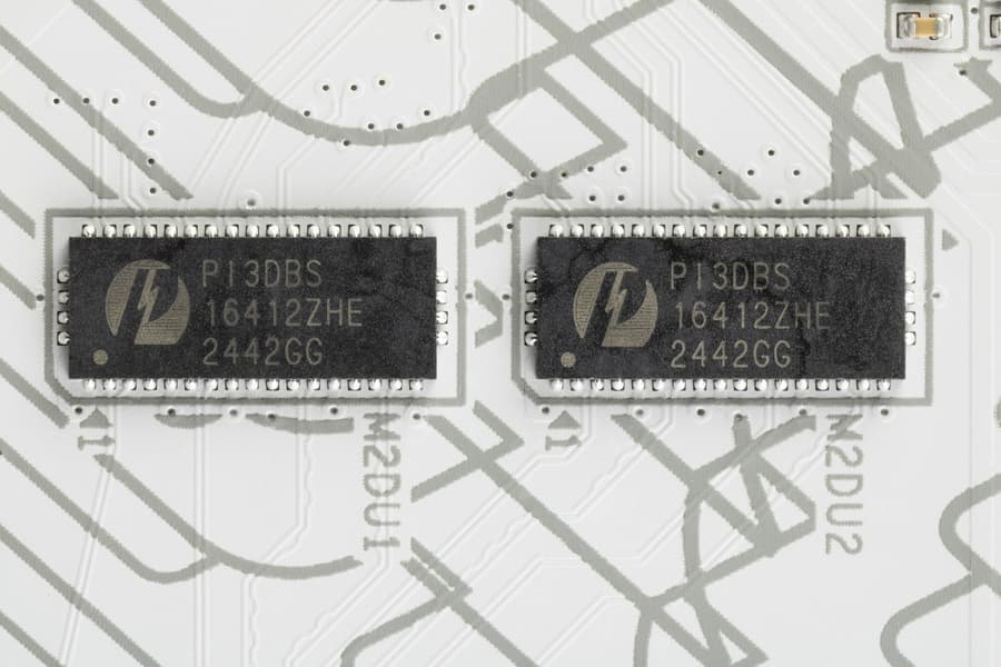 Для переключения ресурсов между слотом PCIe x16_2 и слотом M2D_SB используются мультиплексоры от Diodes Inc.