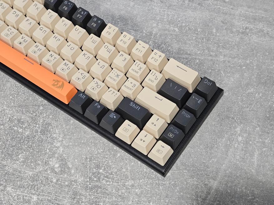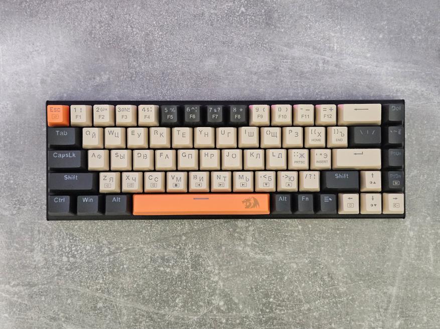 В большинстве игрушек используется лишь ограниченное количество кнопок. Из-за этого в том числе и выпускаются компактные клавиатуры. Это не снижает их удобства и производительности, зато экономит пространство на столе. Например, Redragon Ryze на 68 клавиш не хуже полноразмерных аналогов смогла сохранить все нужные для гейминга кнопки. На мой взгляд, девайс от Redragon имеет стильный дизайн. Сочетание кремового корпуса, оранжевых деталей и подсветки создаёт ретро-футуристичный облик. Клавиатура достаточно компактная, имеет небольшую платформу, на которой установлены свечи и сами кепки.