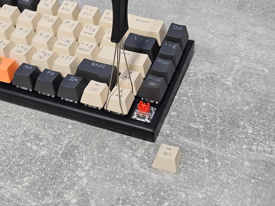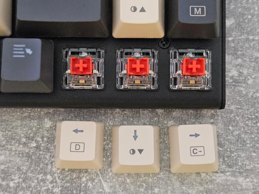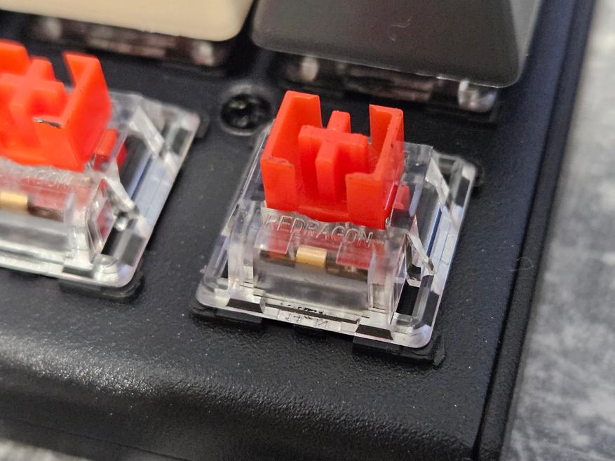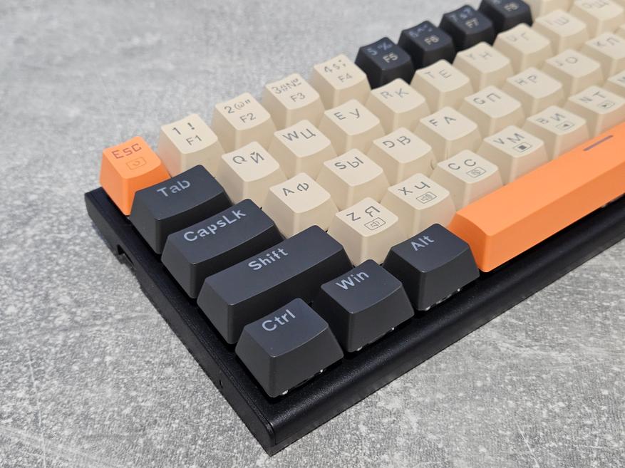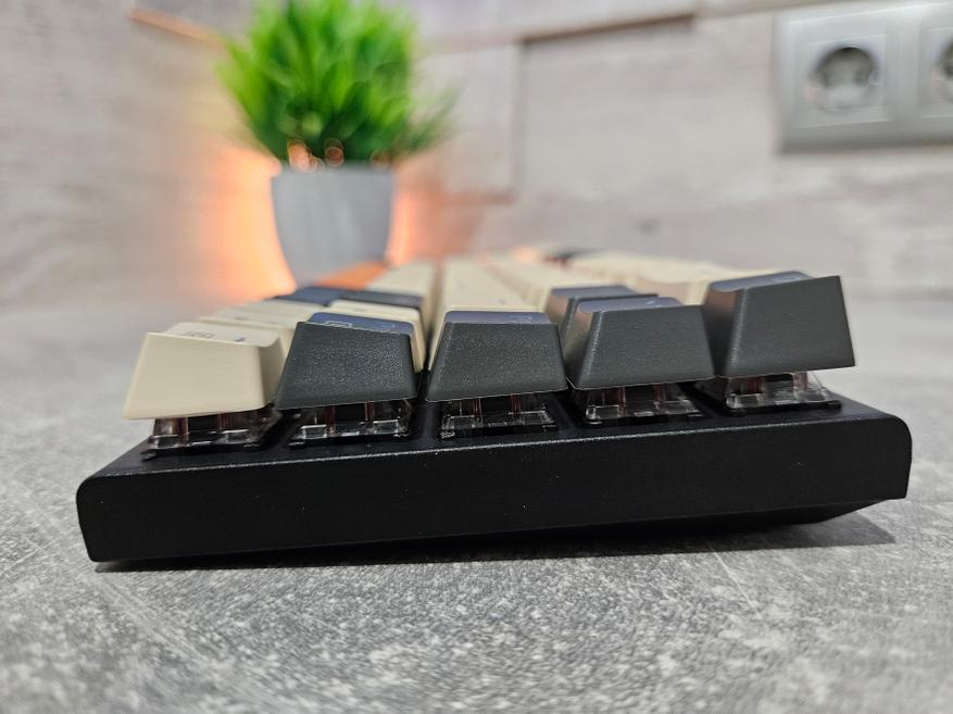 Кейкапы сделаны по технологии двойного литья — прозрачный пластик вдавлен в другой, что обеспечивает долговечность символов. В этой модели установлены базовые свитчи OUTEMU Red, которые можно отнести к начальному уровню. Они линейные, с ходом клавиши 4 мм и срабатыванием на 2 мм. Сила нажатия составляет 45 грамм, поэтому клавиши нажимаются очень легко. Клавиатура поддерживает хотсвап — замену переключателей без пайки.