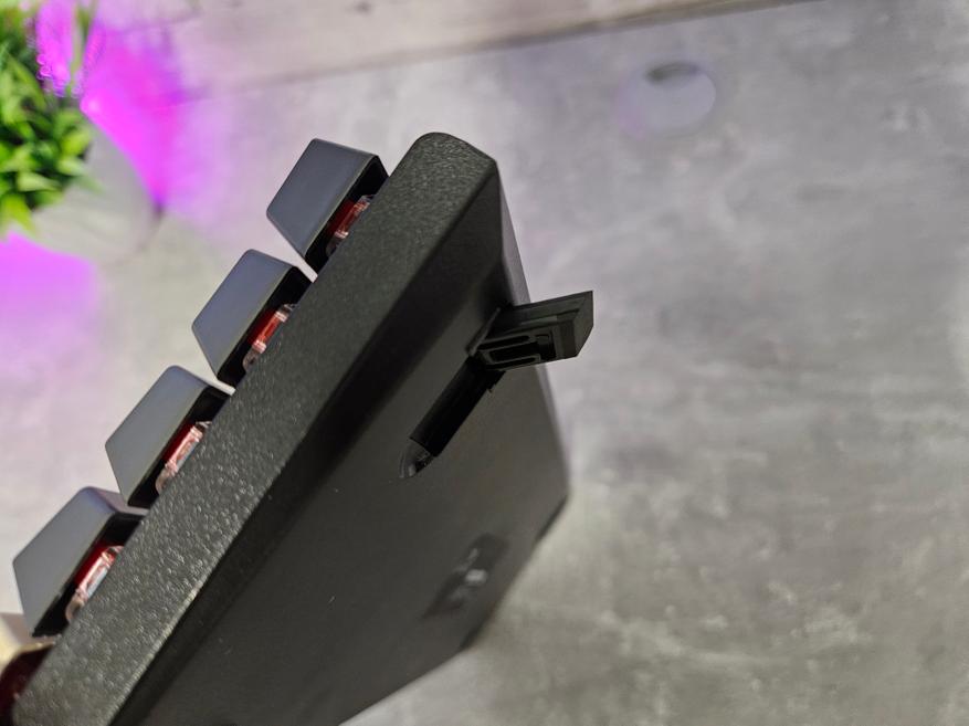 Понятно, почему подсветка называется дышащей. Ещё такую клавиатуру называют скелетоном — у неё как бы кости наружу. Подсветка выглядит намного ярче, чем у клавиатур с утопленными в площадку свечами. На нижней части есть небольшая информационной вставка и четыре ножки против скольжения. Причем дальние откидные — есть возможность приподнять клавиатуру, если вам будет так удобнее печатать или играть. Порт питания usb type c в Redragon Ryze находится на левом торце.