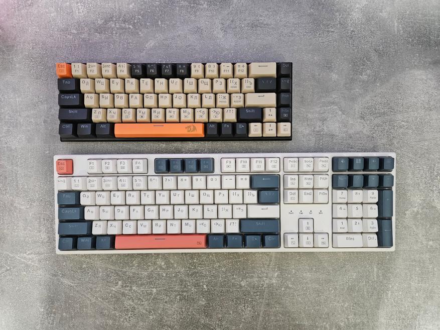 Для лучшего понимания размера Redragon Ryze прикладываю фото сравнения с другими механическими клавиатурами. Redragon Whisper (104 клавиши) — самая крупная белого цвета. Panteon t21 pro rs hs (87 клавиш) — средняя среди всех трех.