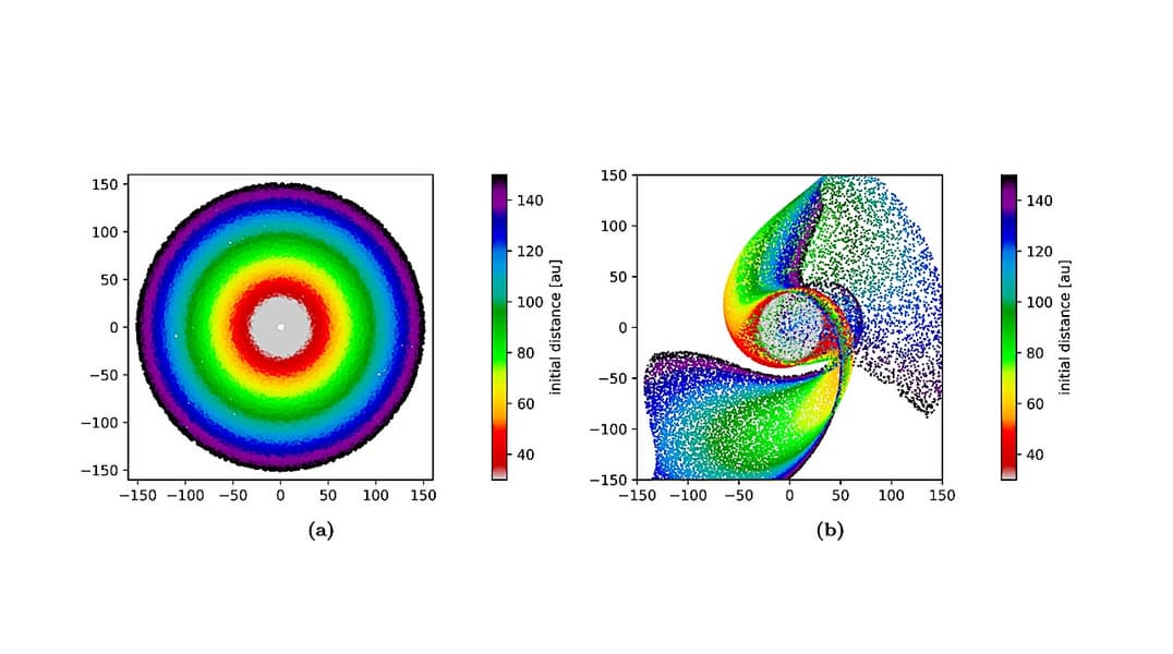 Эти цвета служат условным обозначением: они отображают исходное положение объектов в первичном диске до гравитационного возмущения. Такой приём позволяет проследить, как близкий пролёт звезды мог перераспределить орбиты тел и одновременно сформировать наблюдаемые сегодня связи между их динамикой и спектральными характеристиками.