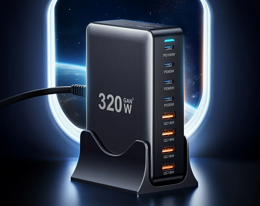 А вот если вам нужно максимально функциональное и мощное решение, то обратите внимание на настольную многопортовую зарядку Essager 320W. Разместив ее на рабочем столе вы полностью закроете вопрос питания и зарядки своих устройств дома или на работе. Максимально на порт она может выдавать 100W, чего достаточно даже для прожорливых ноутбуков, а наличие сразу 8 разъемов (4 USB-C и 4 USB-А) закрывает вопрос одновременной подзарядки большого количества устройств. Без проблем вы можете одновременно подзарядить пару смартфонов, планшет, умные часы и ноутбук. Суммарная мощность достигает невероятных 320W! Мощность делится между потребителями по определенной схеме (можно изучить на странице товара). Зарядка устанавливается вертикально в специальную подставку и практически не занимает свободного пространства. Максимальная поддержка протоколов обеспечивает совместимость с разными стандартами быстрой зарядки (PPS, PD 3.0, QC 4.0, SCP, FCP). Но обратите внимание, что не поддерживаются протоколы быстрой зарядки для смартфонов Xiaomi, Redmi и Poco.