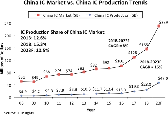 По данным IC Insights, в 2013 году потребности покрывались на 12,6%, а в прошлом году этот показатель увеличился до 15,3%. Аналитики прогнозируют, что в 2023 году Китай будет обеспечивать за счет собственного производства 20,5 % потребностей в микросхемах. При этом рынок микросхем за пять лет увеличится со 155 до 229 млрд долларов, а объем выпуска — с 23,8 до 47,0 млрд долларов, то есть примерно вдвое. Для этого необходимо, чтобы в период с 2018 по 2023 год выпуск микросхем рос примерно на 15% год.